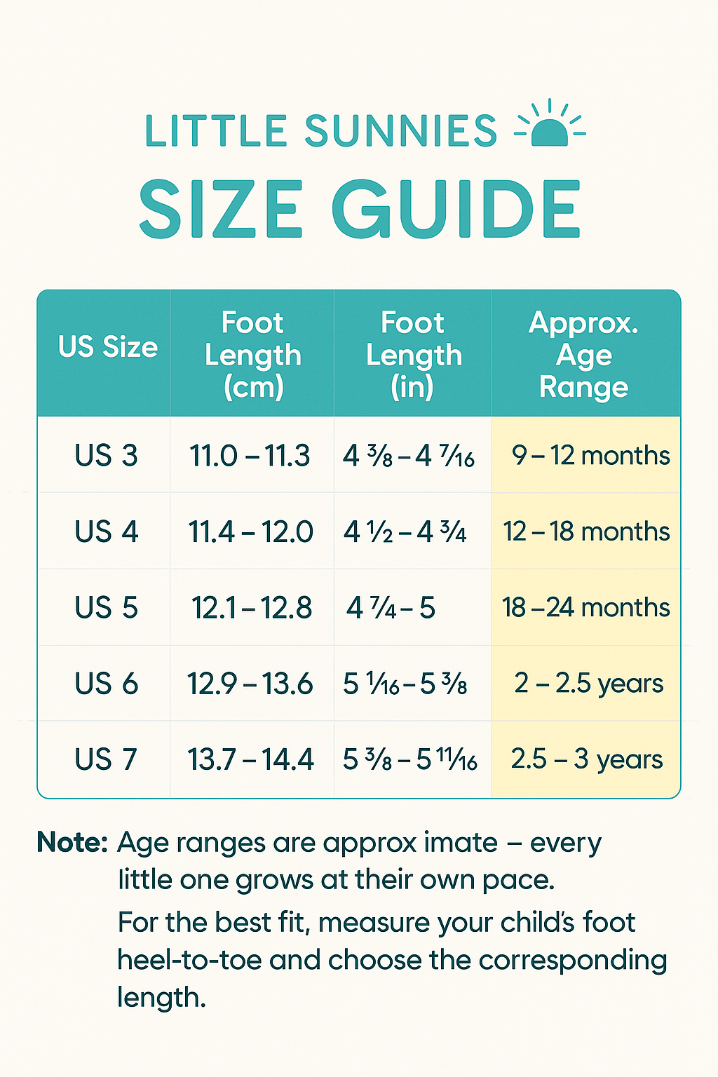 We recommend measuring your child’s foot from heel to toe and comparing it with our Size Guide chart on each product page. For the best fit, we have already included 0.5 cm (¼ inch) of growing room.